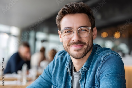 Confident man wearing glasses smiling in office setting
