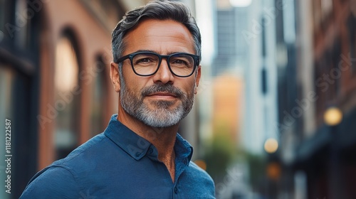 man, male, portrait, head shot, face, goggles, grey, hair, beard, confident, businessman, professional, urban, city, outdoors, street, background, blur, shallow, depth, field, expression, serious, mature, middle-aged