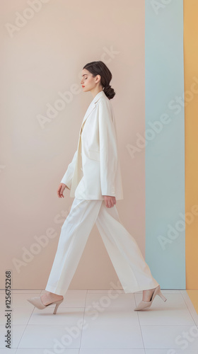 model, woman, walking, fashion, elegant, pastel, heel, stylish, portrait, professional, confident, modern, chic, business, outfit, studio, pose, beauty, trendy, minimalistic, indoor, full body, half face, sophisticated