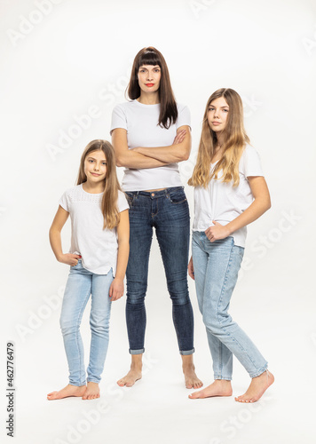 confident, mother, arm, crossed, standing, daughter, studio, family, copy space, three, people, adult, children, girl, group, woman, preteen, casual attire, sibling, white, plain, mature, cut-out, female, blond, confidence, sister, brown hair, togetherness, caucasian, bonding, lifestyle, long hair, hair, love, positive, emotion