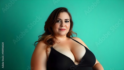 Confident plus size woman radiating body positivity in black swimsuit against vibrant teal backdrop embodying self-love and summer vibes