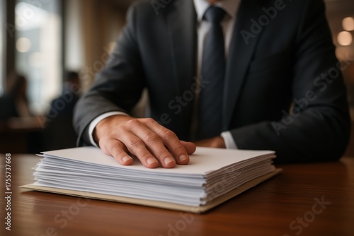 Confident Professional at Work: A poised individual, dressed impeccably in a suit and tie, rests a hand upon a stack of important documents, embodying professional authority.