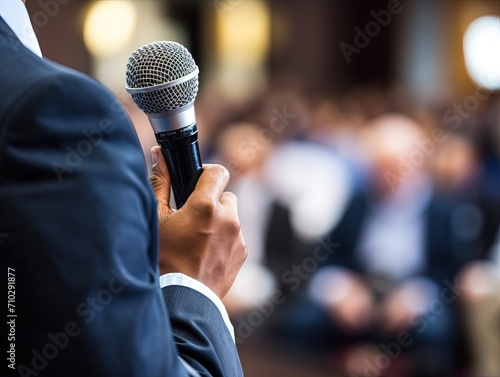 Confident Question: Seminar Attendee with Microphone,Engaged Seminar Participant