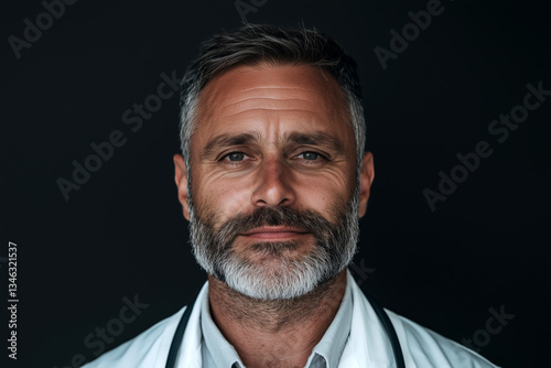 Confident Senior Doctor with Stethoscope Looking at Camera in Dark Studio