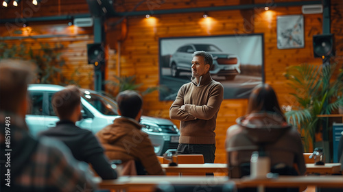 presenter, audience, workshop, indoor, evening, man, seated, people, table, presentation, attentive, cosy, arms crossed, speaking, event, group, inform, educational, seminar, communication, lecture, casual attire, discussion, engagement, learning, indoor, collaboration, interaction