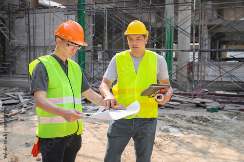 Confident team of architect working together in building construction site. They discussing about new startup project. Architect discuss with engineer about project . Architectural concept.