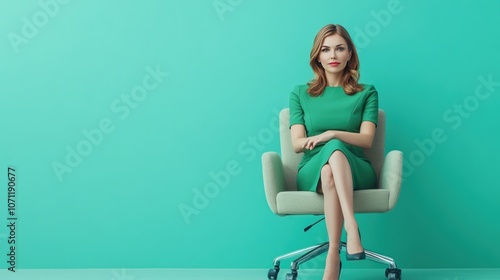Confident Woman in Green Dress Sitting in a Chair Against a Teal Background