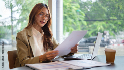 Confident young businesswoman reading documents while working on a laptop at a modern cafe.