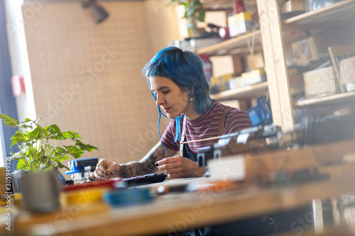 bricolage, hipster, colourful, hair, tattoo, woman, female, owner, profession, service, workshop, small business, employee, working, technician, workplace, maintenance, adult, people, expert, entrepreneur, occupation, skill, craft, garage, hobby, lifestyle, tool, one person, concentration, creativity, precision, hand-made, quality, creative, plank, shop, carpenter, carpenter's shop, wood, woodworker, safety, repair, mender, woodwork, artisan