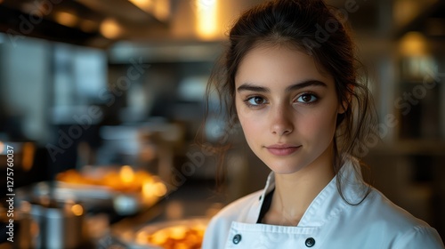 chef, cook, kitchen, eatery, female, woman, young, girl, portrait, food, cooking, professional, career, confident, serious, determined, beautiful, attractive, face, expression, culinary, hospitality, industry, employee, staff, men at work, uniform, white coat, buttons, hair, brunette, indoor, lighting, bokeh, blurred background, depth of field, closeup