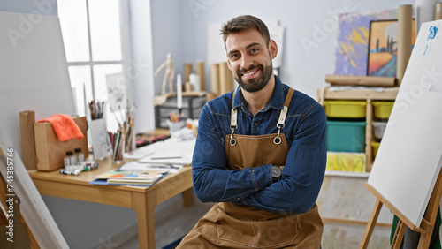 Confident young hispanic man, a prolific artist, enjoys his hobby, learning to paint indoors - smiling effortlessly, sitting with a relaxed cross-armed gesture in an art studio