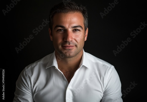 man, portrait, confidence, professional, white shirt, dark background, adult, serious, business, male, expression, lifestyle, studio, head shot, beauty, formal, smiling, relaxation, calm, attractive, engagement, person, emotion, adult male, young adult, business attire, looking, photographic, closeup, photogenic, facial features, attitude, individual, simplicity, charisma, pose, front view, personal, style, expressionless, mature, elegance, modern style