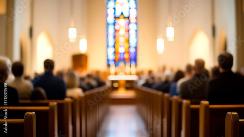 Congregation in a house of worship, gathered for service or event. Stained glass window and warm lighting contribute to the serene atmosphere.