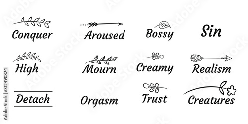 Conquer, High, Detach, Aroused, Mourn, Orgasm, Bossy, Creamy, Trust, Sin, Realism, Creatures. Calligraphy saying for print. Vector Quote