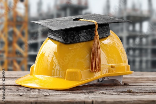 construction, hard hat, mortarboard, education, learning, graduation, success, building, project, development, career, future, engineering, architecture, skill, trade, apprentice, training, safety, helmet, achievement, academic, industry, cognition, skill, job, work, study, progress, growth, improvement, qualification, certificate, degree, construction site, teamwork, wood, site, crane, tower, background, blurred, labor, hard work, challenge, motivation, ambition, goal, determination