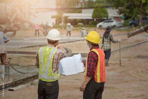 Construction engineers supervising progress of construction project stand on new factory,