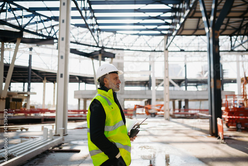 construction, supervisor, manager, engineer, radio, walkie-talkie, communication, copy space, man, photogenic, talking, coordination, documentation, clipboard, plan, safety, vest, hard hat, helmet, building, project, inspection, control, site, men at work, leadership, senior, planning, task, teamwork, operation, foreman, industrial, sunlight, command, infrastructure, directing, construction worker, professional, authority, decision-making, instruction, urban, management, monitoring, dust