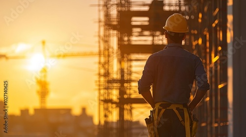 Construction foreman silhouetted against a golden sunset, industrial site with scaffolding, professional development in building and safety, engineering role