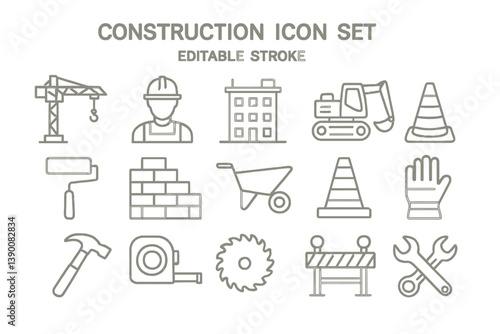 construction, icon, set, tool, equipment, men at work, crane, hard, hat, building, wheelbarrow, safety, cone, hammer, saw, tape, measure, shovel, glove, brick, architecture, machinery, site, renovation, project, industry, labor, design, line, art, graphic, editable, technical, infrastructure, development, engineer, planning, work, repair, productivity, craftsmanship, blueprint, structure, manager, heavy