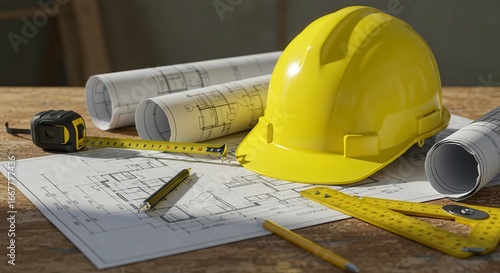 hard hat, blueprint, construction, engineering, safety, architecture, planning, measuring tape, project, industry, tool, building, site, professional, design, table, draft, plan, development, civil, equipment, infrastructure, workplace, men at work, protective, property, survey, technical, contractor, structural, job, renovation, management, housing, document, technology, profession