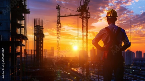 construction, sunset, men at work, crane, building, city, urban, skyline, silhouette, orange, yellow, blue, sky, sun, cloud, industrial, development, progress, architecture, structure, hard hat, engineering, steel, framework, labor, effort, planning, design, horizon, evening, industry, equipment, machinery, scaffolding, project, urbanisation, landscape, activity