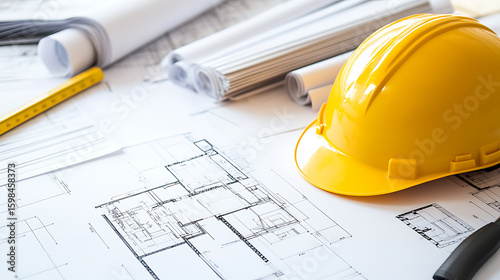 Construction site blueprint with yellow hardhat, scale, pencil and rolled plans: safety and precision for building projects. Architecture and engineering.