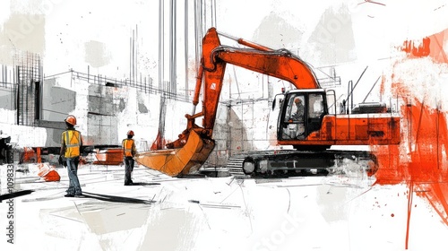 Construction Site Illustration: Excavator and Workers in Abstract Style