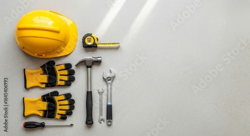 construction, tool, safety, hard hat, helmet, glove, hammer, wrench, screwdriver, equipment, work, building, industry, repair, renovation, project, bricolage, handyman, trade, workshop, maintenance, improvement, professional, labor, manual, protection, gear, topview, background, space, copy, grey, clean, organised, minimal, nobody, still life, object, collection, set, essential, concept, symbol, architecture, carpenter's shop, engineering, contractor