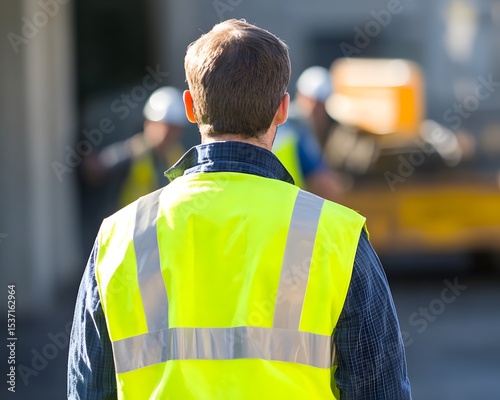 construction worker, backview, men at work, construction, safety, vest, site, industrial, man, person, back, view, yellow vest, workwear, uniform, labourer, building site, working man, occupation, job, employment, industry, contractor, engineer, helmet, hard hat, protective clothing, daylight, sunlight, bright, background, blurred background, equipment, machinery, scene, image, photo, photo