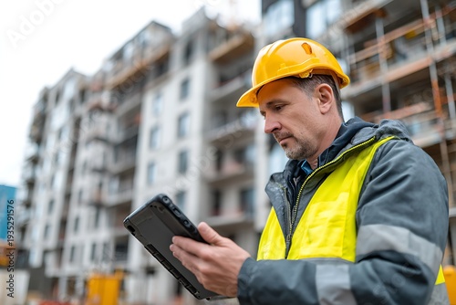 Construction worker checking building plans on digital tablet