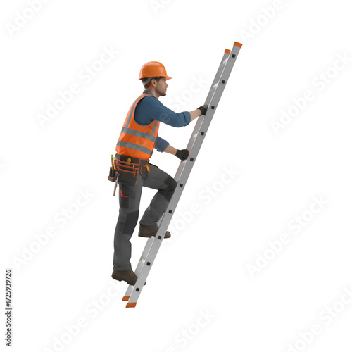 Construction Worker Climbing Ladder: Safety, Work, Industry on white background