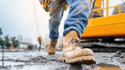 Construction Worker in Safety Boots Walking on Muddy Concrete Site with Heavy Machinery and Tools - Industrial Workforce in Action