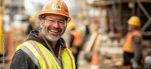 Construction worker smiling, safety gear, busy site, teamwork, professionalism