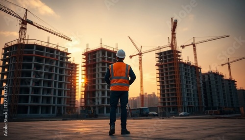 Construction Worker Supervising High Rise Building Construction at Sunset