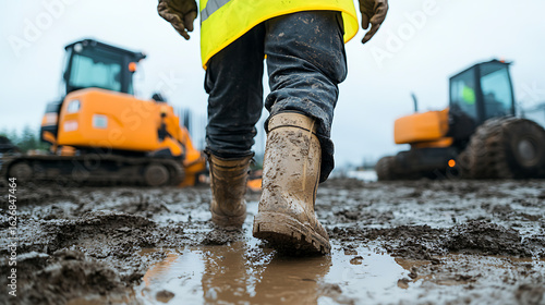 Construction worker walks through muddy job site with heavy equipment. Focused on safe and proper footwear. Safety vest and work boots shown.