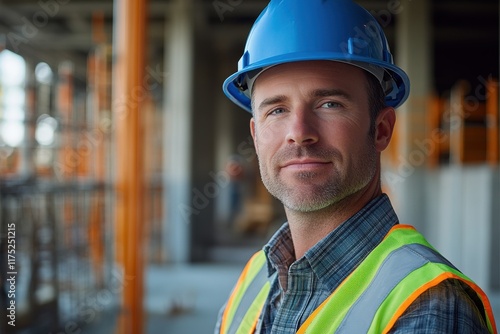 Construction worker wearing safety gear smiles confidently at a job site during daylight hours, showcasing dedication to building safety and teamwork