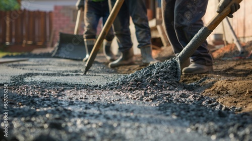 construction, men at work, concrete, spreading, shovel, work, labor, building, project, site, contractor, industry, labourer, teamwork, effort, daytime, ground, groundwork, foundation, infrastructure, development, urban, laying, paving, asphalt, mix, cement, aggregate, compacting, finishing, shopkeeper, skilled, workwear, boot