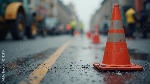 road, work, construction, urban, street, men at work, traffic, cone, repair, evening, rain, city, vehicle, site, infrastructure, safety, gear, planning, public, work, orange, fog, labor, wet, pavement, light, maintenance, control, machinery, community, landscape, raining, passing, tool, tied-up, development, crew, heavy, metropolitan, area, emergency, service, transportation
