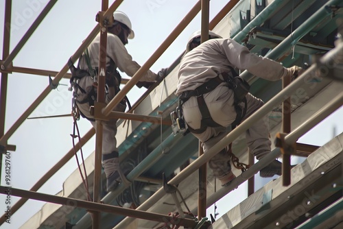construction, men at work, scaffolding, building, safety, work, high, equipment, labor, industry, project, helmet, harness, metal, structure, site, professional, team, manual, dangerous, industrial, urban, maintenance, working, height, skilled, labourer, trade, engineering, job, first, men at work, hard, hat, hat