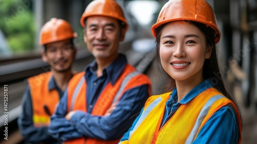 men at work, construction, team, smiling, confident, safety, orange, helmet, railway, portrait, closeup, people, asian, three, man, woman, industrial, focused, community, positive, collaboration, industry, infrastructure, employee, building, project, modern, professional, happy, success, united, determination, pride, perspective, equipment, sharpened, bright, support, skilled, manpower, day