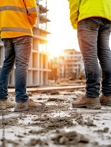 Construction workers standing on site in safety boots and reflective jackets at sunset with unfinished building in background