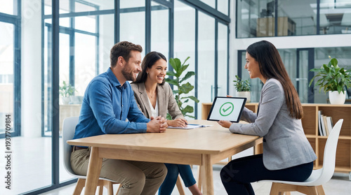approval, consultation, tablet, checkmark, client, adviser, meeting, office, contract, trust, marketing, advertising, campaign, promotion, sale, friendly, confident, professional, smiling, communication, negotiation, service, insurance, loan, mortgage, paperwork, signature, agreements, verification, success, business, support, partnership, finance, customer service