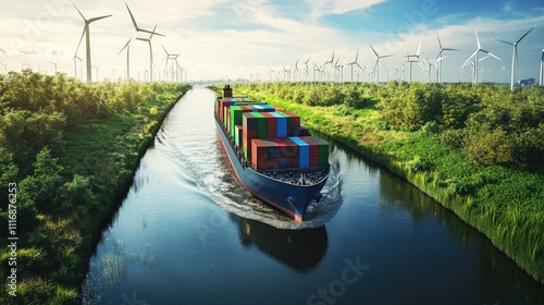 Container ship sailing through a canal lined with futuristic green energy wind turbines, eco-friendly trade concept