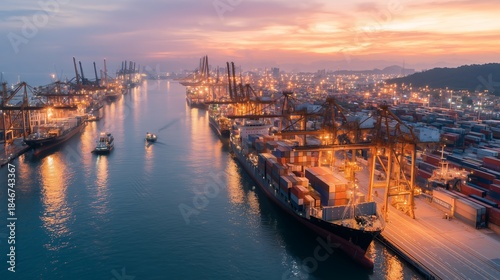 Containers are being loaded at the shipping port during sunset with lights glowing in the sky