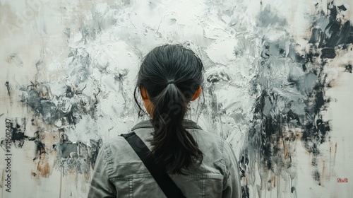 Contemplative Asian Artist Surrounded by Shades of Gray and White on Canvas