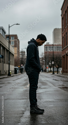 man, sad, lonely, street, city, alone, person, depressed, black, urban, young, male, standing, contemplative, pensive, thinking, moody, sombre, wet, rain, road, african, american, hoodie, sorrowful, depression, loneliness, solitude, problem, mental, health, thoughtful, introspective, down, gloomy, overcast, pavement, asphalt, background, building, casual attire, fashion, boot, dark