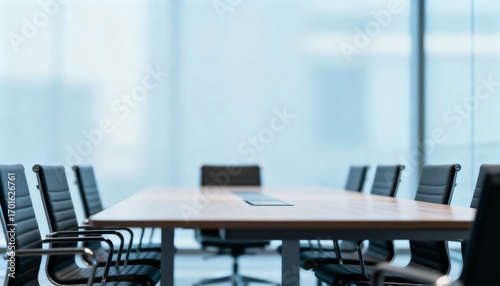 Contemporary Boardroom Setting Featuring a Large Wooden Table and Sleek Black Chairs with Soft Focus