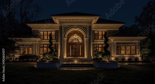 Contemporary lavish home lit in darkness highlighting refined architectural details