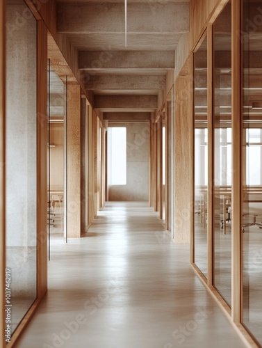 modern, office, contemporary, design, open, floor, plan, wooden, accent, natural, light, hallway, clean, line, minimalist, functional, workspace, collaborative, environment, glasses, partition, large, window, brightly, lit, space, wood, tile, stone, interior, corridor, architecture