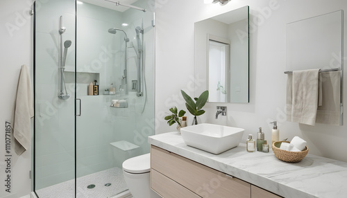 bathroom, small, minimalist, white, floating, vanity, marble, countertop, shower, glasses, clean, modern, sleek, contemporary, design, polished, functional, interior, elegant, minimal, decor, stylish, luxurious, home, compact, fresh, clear, modern style, mirror, room, luxury, house, bathe, sink